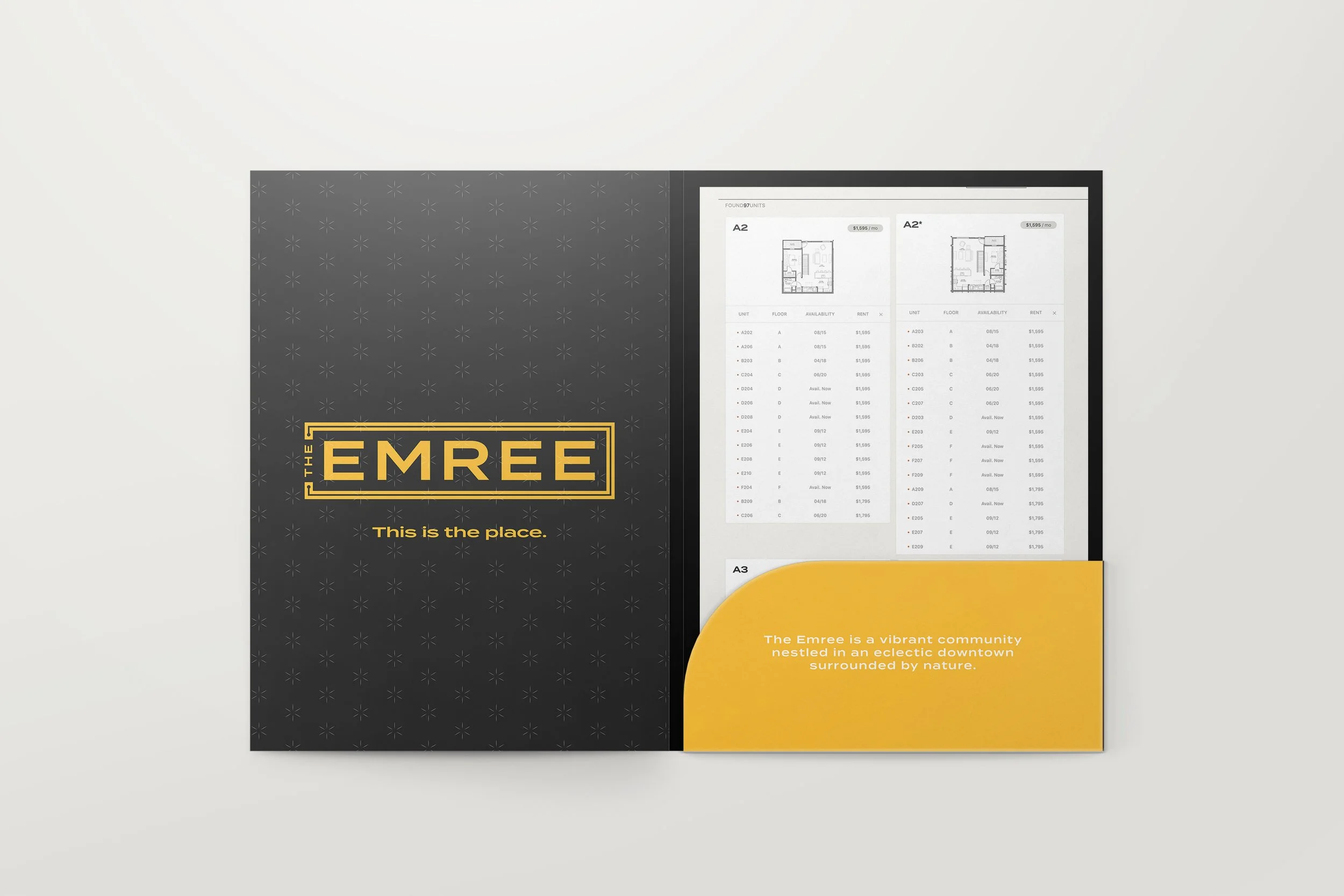 For The Emree, a modern garden-style apartment development in West Bend, WI, I created the full brand identity—from naming inspiration to execution. Drawing on the area’s industrial heritage, I designed a logo and visual system that gives a contemporary voice to the city’s roots. The name, a stylized evolution of Emrey (meaning industrious or powerful), reflects both strength and refinement.