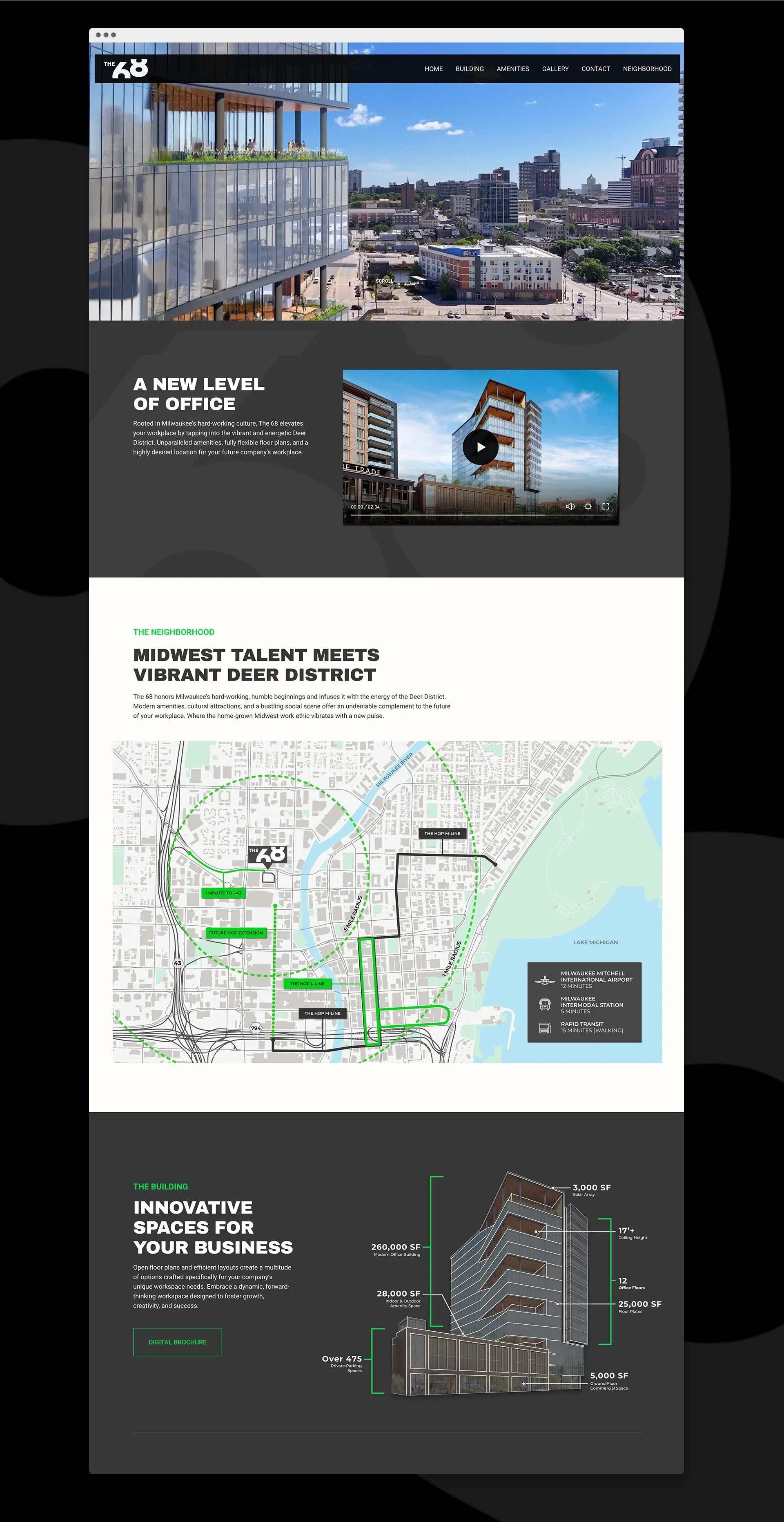 I created the website for The 68, a hospitality-focused office development in Milwaukee, highlighting its flexible floor plans, prime Deer District location, and community-driven amenities.
